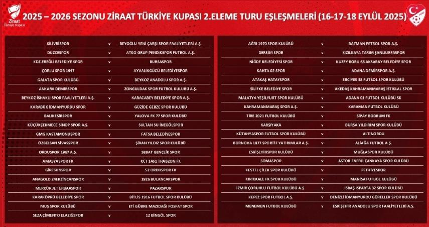 Ziraat Türkiye Kupası'nda heyecan tüm hızıyla devam ediyor. 2025-2026 sezonu 2. Eleme Turu kura çekimi, Türkiye Futbol Federasyonu (TFF) tarafından, Riva'da bulunan Hasan Doğan Millî Takımlar Kamp ve Eğitim Tesisleri'nde düzenlenen törenle gerçekleştirildi.